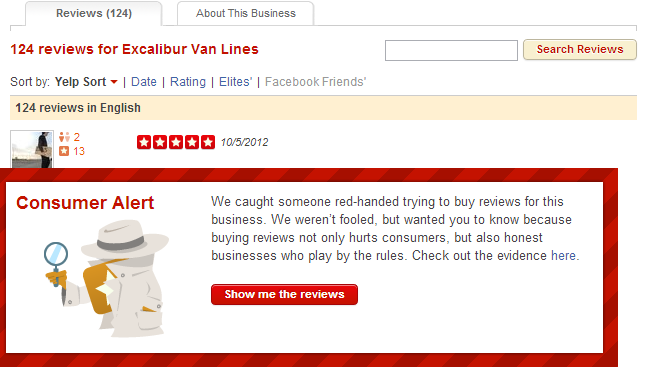 Recently the popular user-review site Yelp.com announced that it had proof that some of the reviews posted on its site were bought. Yelp quickly took steps to publicly identify some of these miscreants by posting warning messages alongside the fake reviews, using a “badge of shame” approach. For three months, Yelp will display an “alert” on the offending company’s profile page that says: “We caught someone red-handed trying to buy reviews for this business!” A sample of the warning message is shown below.