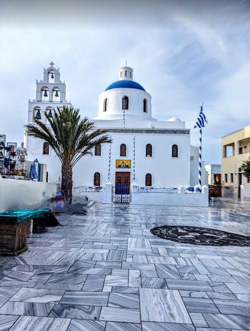 The beautiful white church is located in the main square of Oia Village and overlooks the Aegian Sea.